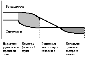 Рационализация демографического воспроизводства, суть которой в возросших возможностях существенного снижения смертности, явление безусловно положительное. Чтобы обеспечить простое воспроизводство, чтобы мать воспроизвела себя как мать, необходимо родить не 4,3–4,4 ребенка, а только 2,1–2,2. Затраты семьи, общества для достижения одного и того же результата сокращаются вдвое! Следовательно можно сократить и рождаемость в два раза, получив тот же результат в воспроизводстве населения. Но к такому воспроизводству активно идет в XXI веке только 1/4 населения, ориентируясь в основном на простое воспроизводство и преодоление депопуляционных тенденций. Однако 3/4 населения земли находятся на стадии расширенного воспроизводства, а регулирование смертности, ее резкое сокращение и рост средней продолжительности жизни не сопровождаются еще заметным снижением рождаемости. Этим объясняется резкое возрастание естественного прироста, получившего название демографического взрыва.