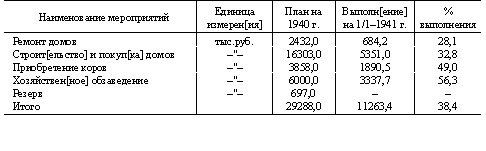 Согласно утвержденного Облисполкомом плана требовалось отремонтировать выделенных сельсоветами и колхозами 9650 домов, отремонтировано 8242 или 85,5 проц[ентов], построить и купить 10350 домов, построено и куплено 5499 или 53,1 проц[ентов], а всего подготовлено 13741 дом или 68,7 проц[ентов] к годовому плану, а к числу прибывших — 15594 хозяйства — 88,1 проц[ентов], таким образом 1853 семьи с самого начала вселения в колхозы постоянными домами были не обеспечены и размещены на временных квартирах у колхозников-старожилов и в общественных зданиях колхозов (контора, детские ясли и проч.).