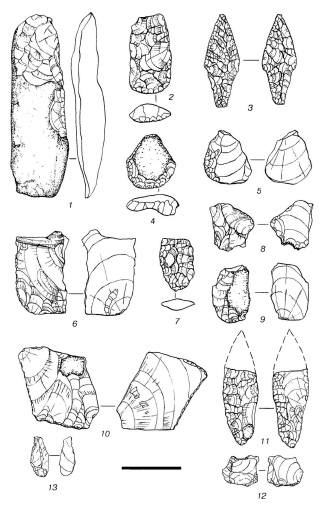 Тесел в коллекции – два образца. Одно – шлифованное односторонне выпуклое, удлиненно-прямоугольных очертаний с прямым рабочим лезвием и округленным обушком, обработанным крупными сколами (см. рис. 1, 1). Второе тесло – небольших размеров, сделано способом двусторонней оббивки и отжима. Лезвие орудия – овальное, обушек слегка приострен (см. рис. 1,2). Наконечник стрелы удлиненно-треугольных очертаний с черешковым основанием, с двух сторон обработан сплошной диагональной отжимной ретушью (см. рис. 1,3). В коллекции имеется также фрагмент черешка наконечника такого типа. Скребки представлены двумя различными типами. Первый грушевидной формы, на высоком отщепе, с круговым лезвием, оформленным крутой ретушью. Имеет черешок для укрепления в рукоятке (рис. 1,4). Второй скребок сделан на пластинчатом отщепе, с двумя лезвиями – концевым и боковым (см. рис. 1,5). Разнообразны по форме ножи (4 экз.). К ним относятся нож-бифас (рис. 1,7), нож-скребок (рис. 1,6), нож с выпуклым лезвием и подтесанной спинкой (рис. 1,9), ассиметричный двухлезвийный нож (рис. 1,10). Скобелей два, изготовлены они на отщепах и имеют две (рис. 1,8) или одну (рис. 1,12) выемку по краю. |