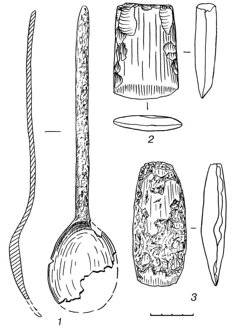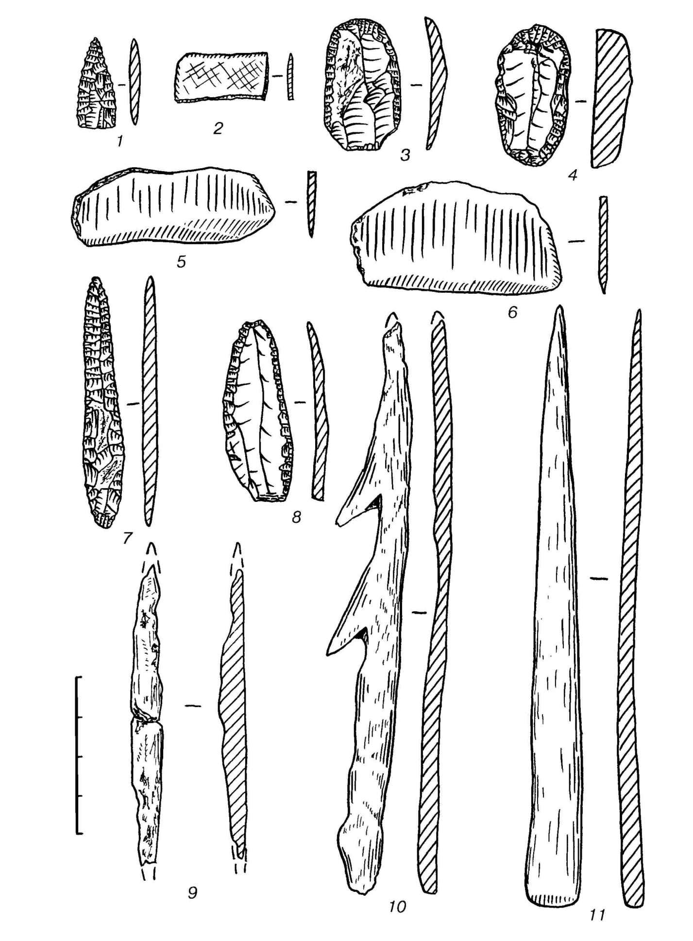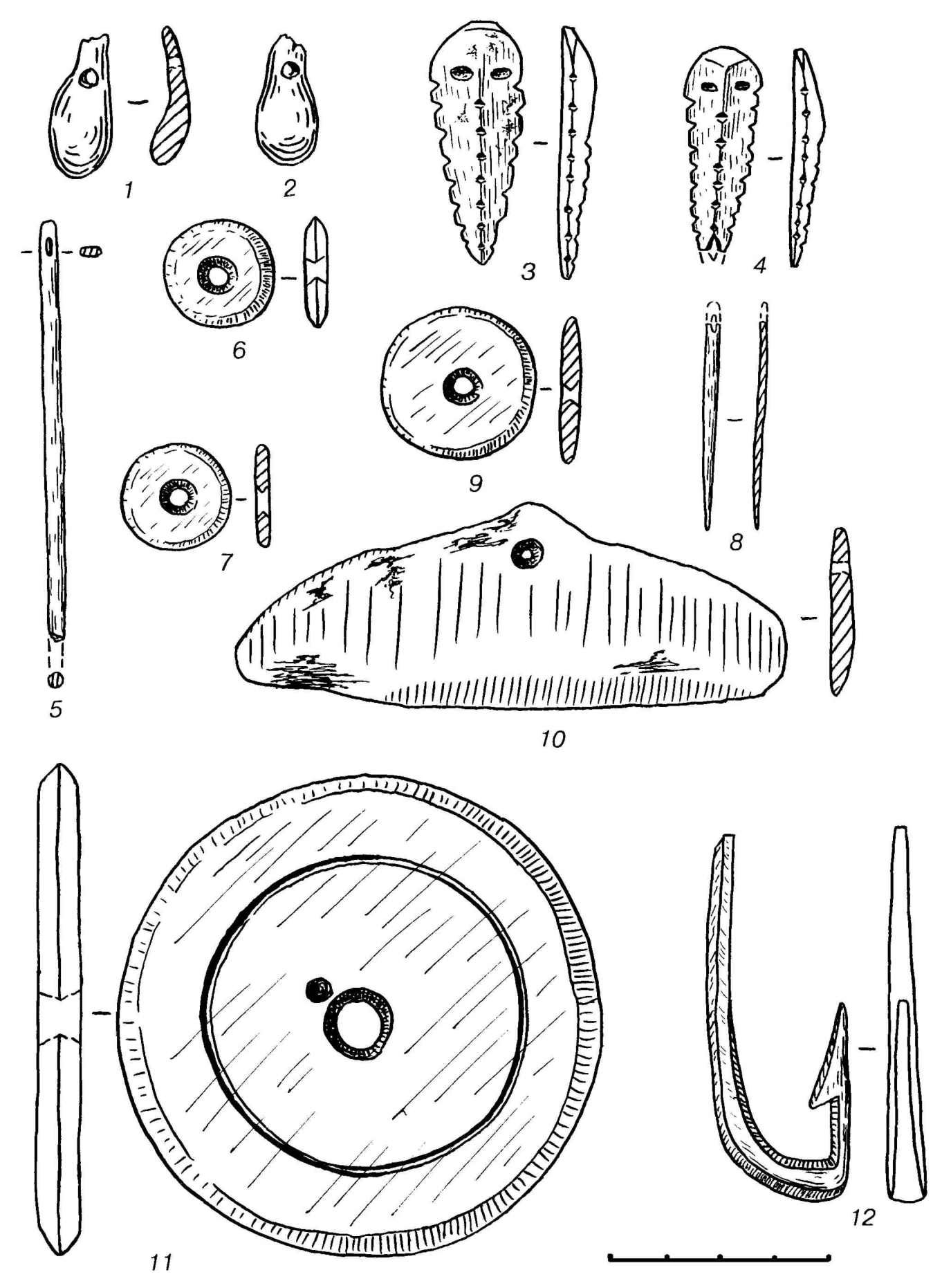 2), топорами – №10 и теслами – №25, 32 с овальным сечением из нефрита (рис. 3.2–3), пластинчатыми ножами из нефрита – №10, 13 (рис. 2.5–6), концевыми скребками – №4, 12 (рис. 2.3–4), листовидным наконечником стрелы со слегка выпуклой базой – №12 (рис. 2.1), проколками и сверлами из кремня – №12 (рис. 2.7), галькой-отбойником и пластинчатыми сколами – №4, односторонними гарпунами – №10 (рис. 2.10), костяным цельнорезным крючком (рис. 4.12) и ложкой с глубоким резервуаром и длинной рукоятью (рис. 3.1) – №12, иглами – №12, 33 (рис.4. 5.8) и остриями – №10, 13 (рис. 2. 9,11) из кости.|