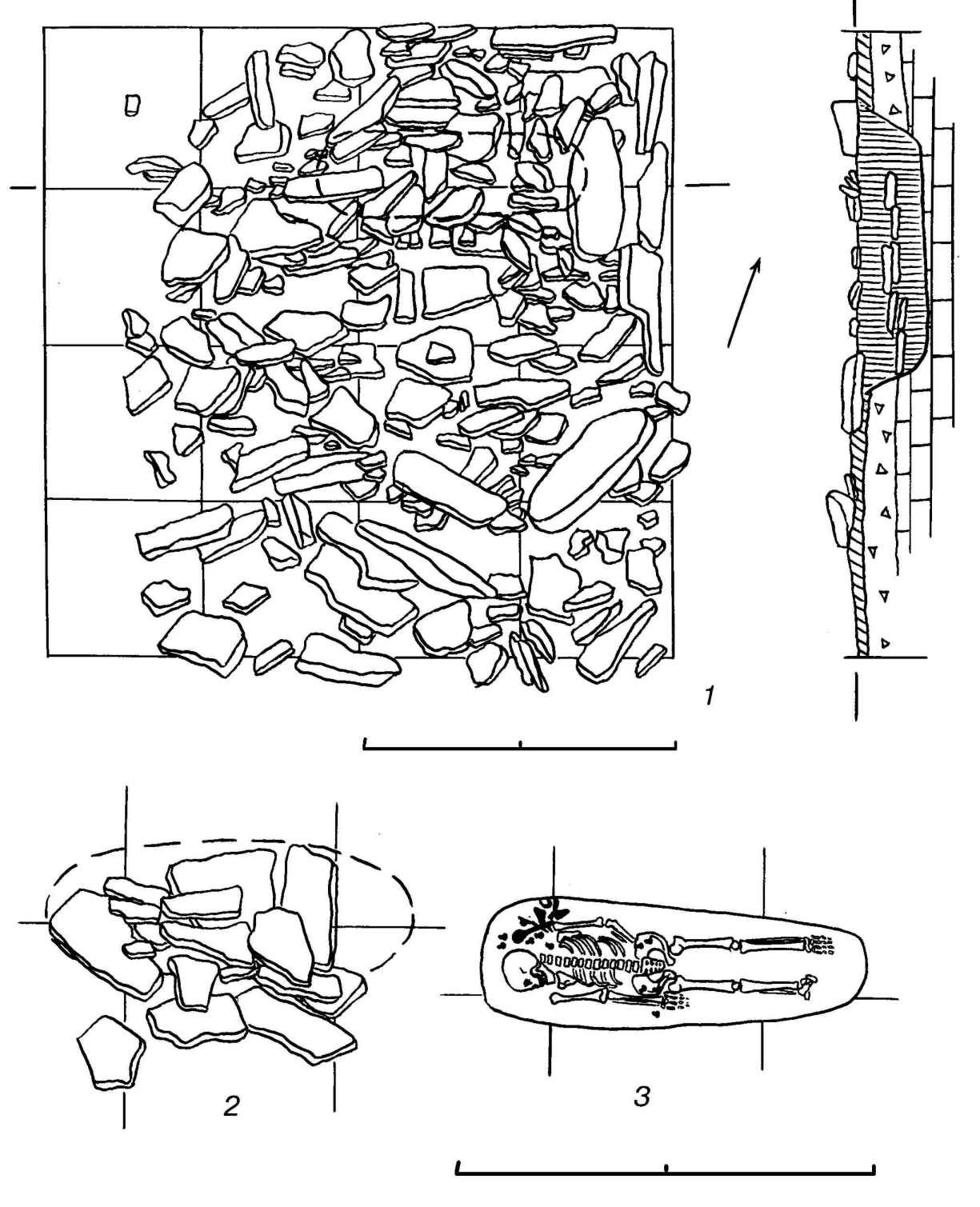 Рис. 1. Погребение №12.1 – надмогильное сооружение; 2 – внутримогильное перекрытие; 3 – погребение. |