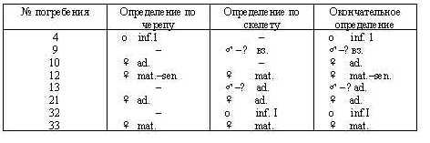 Сохранность костей могильника Сарминский мыс плохая. Из 13 погребений бронзового века полностью разрушено древними грабителями 2 захоронения (№2, 25), 3 могилы – без костяков (№26–28). Остальные 8 погребений представлены, в основном, обломками черепа и костей скелета. Поэтому, при половозрастном определении погребенных учитывались размеры костей, их массивность, состояние зубов, швов и рельефа. Определение пола и возраста проводилось отдельно по фрагментам черепа и по костям скелета. Наибольшее значение при этом придавалось состоянию позвонков и мыщелков длинных костей, так как на них раньше проявляются возрастные изменения. Определение возраста детских костяков делалось, в основном, по порядку прорезывания зубов. Сравнивая определения пола и возраста, сделанные по черепу и скелету, давалось окончательное решение (табл. 1).