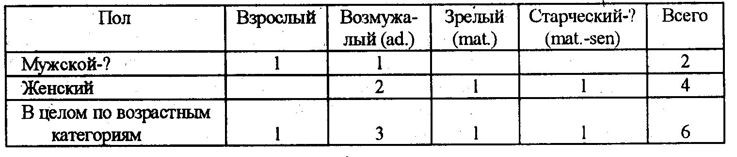 Распределение взрослых по возрастным категориям (табл. 2) свидетельствует, что наибольшая частота приходится на категорию возмужалого возраста (ad.); его достигло 3 человека, умерло в зрелом возрасте – 1 и, вероятно, один человек дожил до старческого возраста (№12). Причем обе последних – женщины.