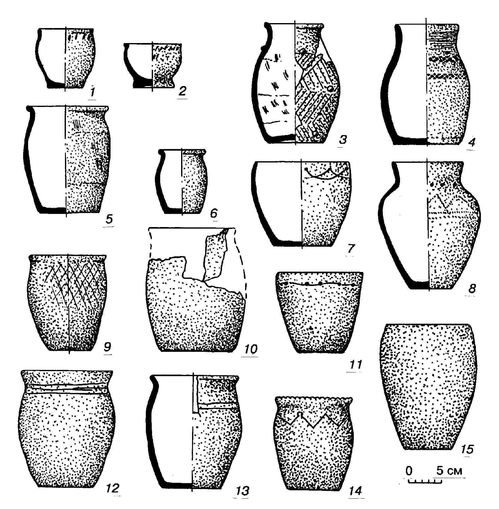 Рис. 1. Керамика древних тюрок Алтая и аналогии ей с сопредельных регионов.1,2 – Кудыргэ, к. 22; 3 – Макажан, оградка; 4 – Юстыд, оградка №2; 5 – Боротал II, к.2; 6 – Юстыд 1, к.8; 7 – Калбак-Таш, к.2; 8 – Ближние Елбаны IV, м.6; 9 – Монгун-Тайга-57-XXXVI; 10 – тюркский ритуальный курган МТ-57-Х1; 11 – Куркутский комплекс; 12 – Бай-Тайга-59-5; 13 – Барбургазы 1, к.19; 14 – Джаргаланты, к.2; 15 – тюркское погребение на р.Таштык. 1-7, 13 – Алтай; 8 – Верхнее Приобье; 9, 10, 12 – Тува; 11 – Прибайкалье; 14 – Монголия; 15 – Минусинская котловина. |