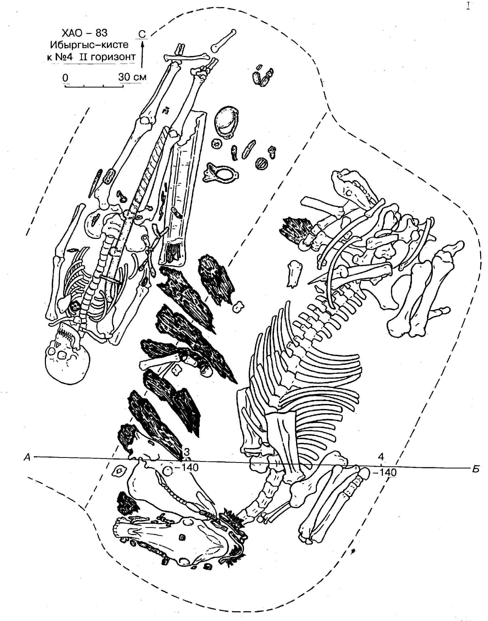5. Погребенный в кургане № 4 могильника Ибыргыс-кисте древнетюркский воин был положен на дно могильной ямы, в подбой, в одежде и с оружием, на спине, в вытянутом положении, был ориентирован головой на юго-запад. В ногах погребенного помещено седло со стременами и нога овцы. Подбой перекрыт наклонными бревнами. На уступе помещен взнузданный конь. Он был положен на живот с подогнутыми ногами, ориентирован головой в ту же сторону, что и человек. Голова коня повернута в сторону умершего человека. Возле головы коня помещена голова второго, заколотого коня. Рядом с крупом положили голову овцы. Часть туши заколотого коня сложили в отдельную яму, рядом с могилой внутри кольцевой насыпи.В Минусинской котловине встречались древнетюркские погребения под плоскими кольцевыми насыпями, в подбоях могильных ям, со скелетами коней на уступах, с одинаковой ориентировкой человека и коня в одну и ту же сторону на юго-запад