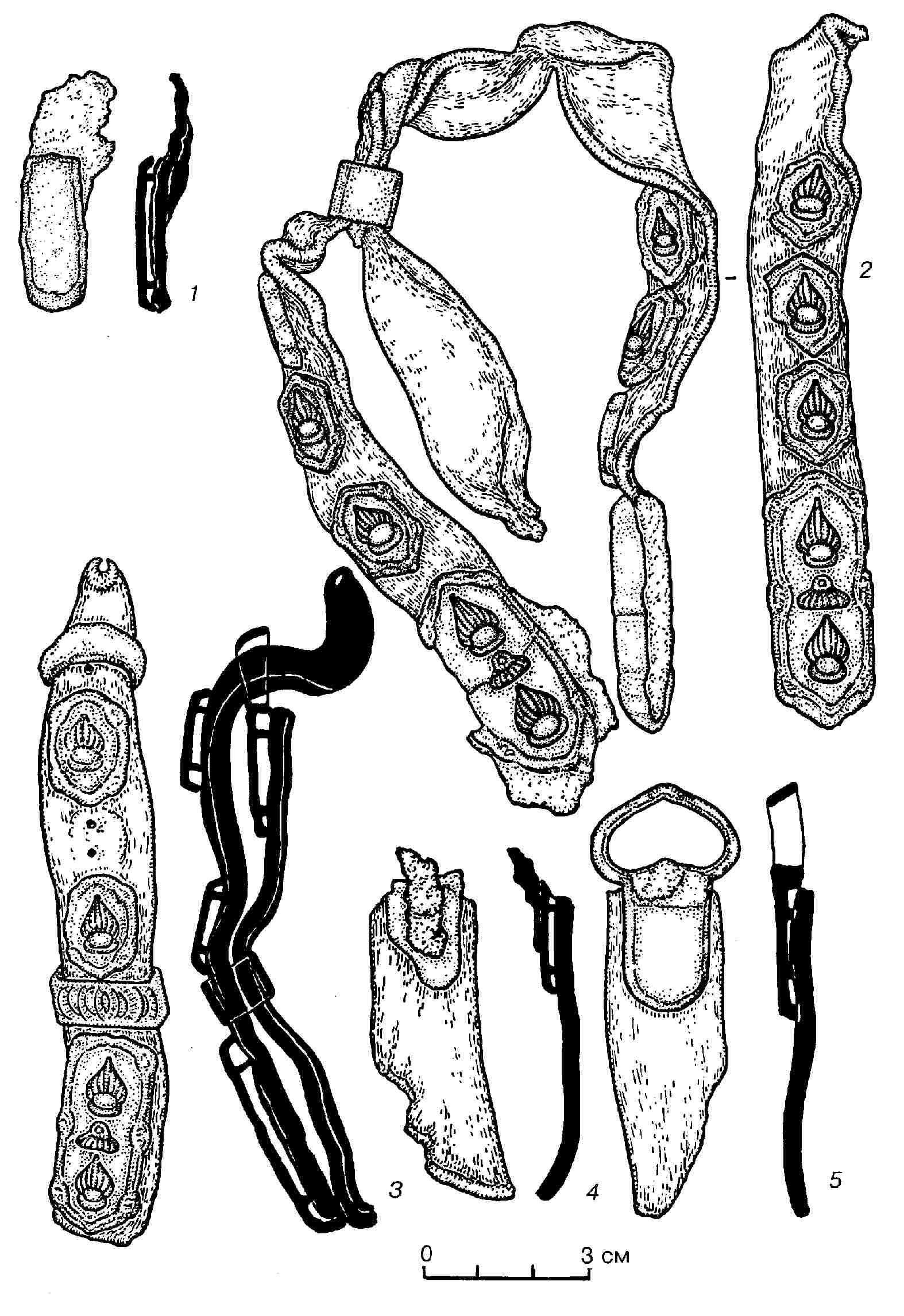 3, 4). Из-за сильной фрагментарности конструкция этих ремней в точности не восстанавливается, в составе колчанной портупеи присутствовали пряжки с гладким щитком, сердцевидные и прямоугольные бляшки с округлым концом без орнамента (см. рис. 3, I, 4, 5; 4, 2, 5, 6).Уздечные и седельные накладки и бляшки с каноническим орнаментом изготовлены из бронзы, но были покрыты позолотой и выглядели очень нарядно, свидетельствуя о достаточно высоком социальном статусе погребенного древнетюркского воина