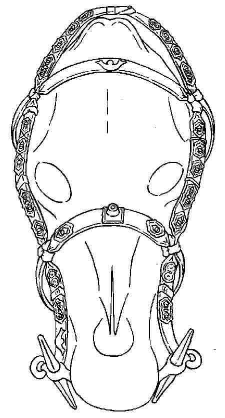 I). Затылочный ремень соединен из двух ремешков. С каждой стороны он украшен удлиненно-шестиугольной накладкой с двумя изображениями чинтамаки и цветком смоквы, и тремя укороченными шестиугольными бляшками с изображением жемчужины в огне. Оба ремешка соединяются пряжкой и обоймой на затылочной части (см. рис. 3, 2). Не вполне ясна конструкция налобного ремня. За черепом коня вместе с затылочным сохранился значительный фрагмент ремня с одной дуговидной бляшкой, украшенной округлым выступом и двумя концами в виде рыбьих хвостов (см. рис. 2, I). Еще одна подобная бляшка с ячеистым орнаментом, изображающим чешую с рыбьим хвостом обнаружена рядом с удилами, с правой стороны черепа коня (см. рис. 2, 6). Если эти бляшки сохранили свое первоначальное положение, то придется признать, что узда имела значительную асимметрию. Остается неясной конструкция оголовья в месте соединения нащечных ремней с подшейным и подчелюстным. Поскольку эти ремни не имели металлических украшений, они не сохранились.