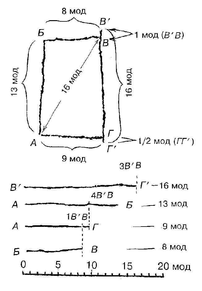 1В, то тогда этот, особо выделенный палеолитическим геометром отрезок уложится целочисленно в длину трех сторон фигуры (БВ – 8 модулей; БА – 13; АГ – 9). Что касается четвертой – ВГ, то принцип целочисленности сохранится здесь лишь в случае принятия в расчет чуть выступающих за пределы прямоугольника концов ее – ВВ1 и ГГ1 (В1Г1 – 16 модулей, при том ГГ1 = 1/2 ВВ1, т. е. второй, нижний, выступающий за пределы прямоугольника отрезок представляет собой своего рода минимодуль – половинную часть первого модуля). Нижняя часть рис. 3 позволяет наглядно представить соотношение размеров сторон фигуры. Самая впечатляющая особенность ее заключается в том, что стороны ее соотносятся друг с другом “по золоту”:![]()