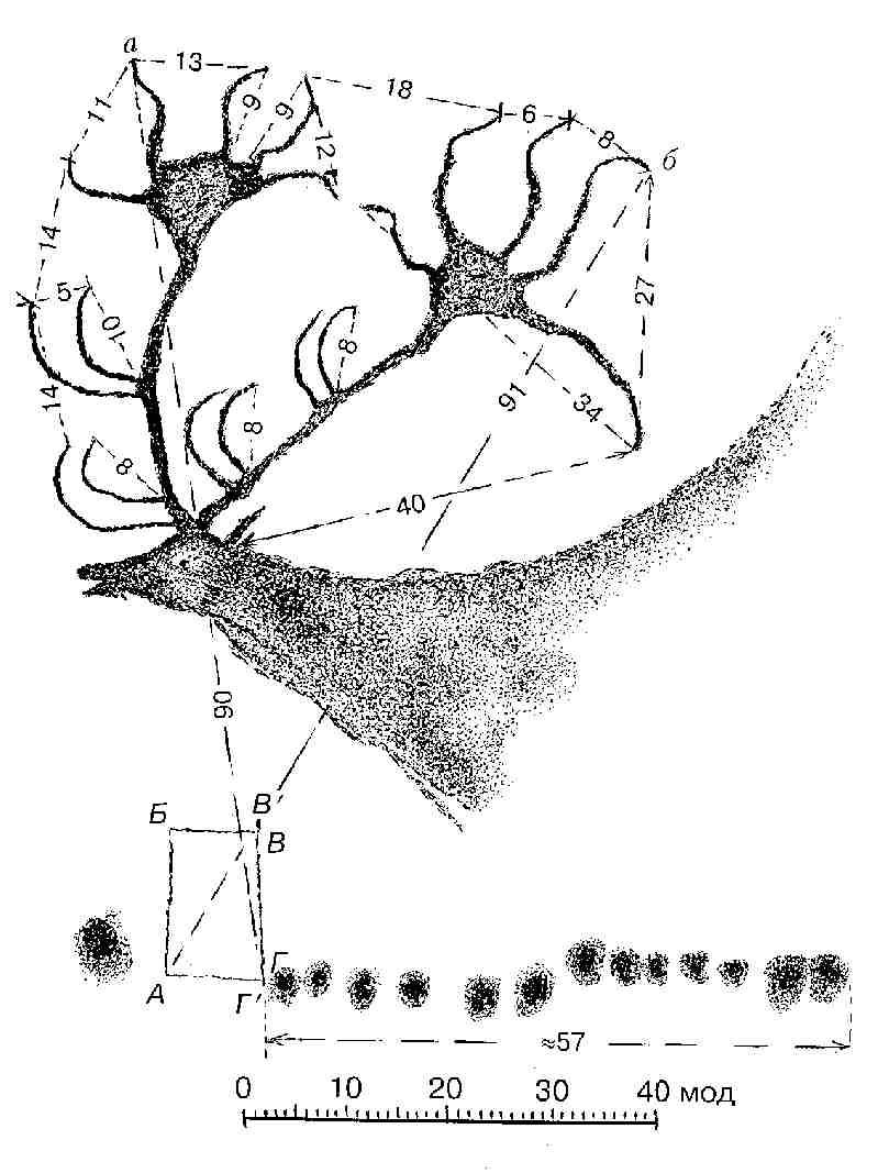 1 и ГГ1, оказывается равной диагонали прямоугольника АВ.Столь важные геометрического плана детали свидетельствуют о тщательной выверенности прямоугольника и о том, сколь непросто то, что археологи определяют термином “тектиформа”. Что касается одной из важнейших деталей геометрической фигуры, включенной в цепочку пятен, а именно – выделенных в ней модулей, то на рис. 4 представлены результаты модульных замеров разного рода расстояний между частью четко определяемых точек рогов, которые смотрятся как измерители, и между двумя (всего лишь для примера!) из этих точек, а и б, и точками А и Г прямоугольника. Как можно убедиться, рисунок оленя и, надо полагать, вся без исключения цепочка знаков ниже его размещались на стене строго продумано и целенаправленно.