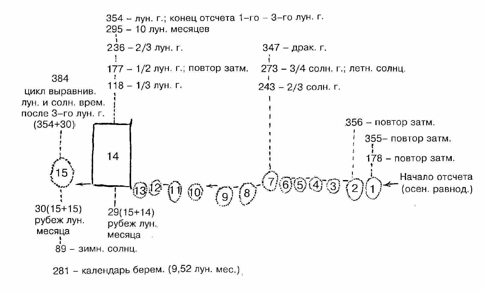 лунных месяцев, с нацеленностью, однако, на заметное выделение кардинальных моментов годового календаря не только лунного, но и солнечного. Условие это будет исполнено в случае счисления времени по следующей формуле:(15 + 15) ® (15 + 14)