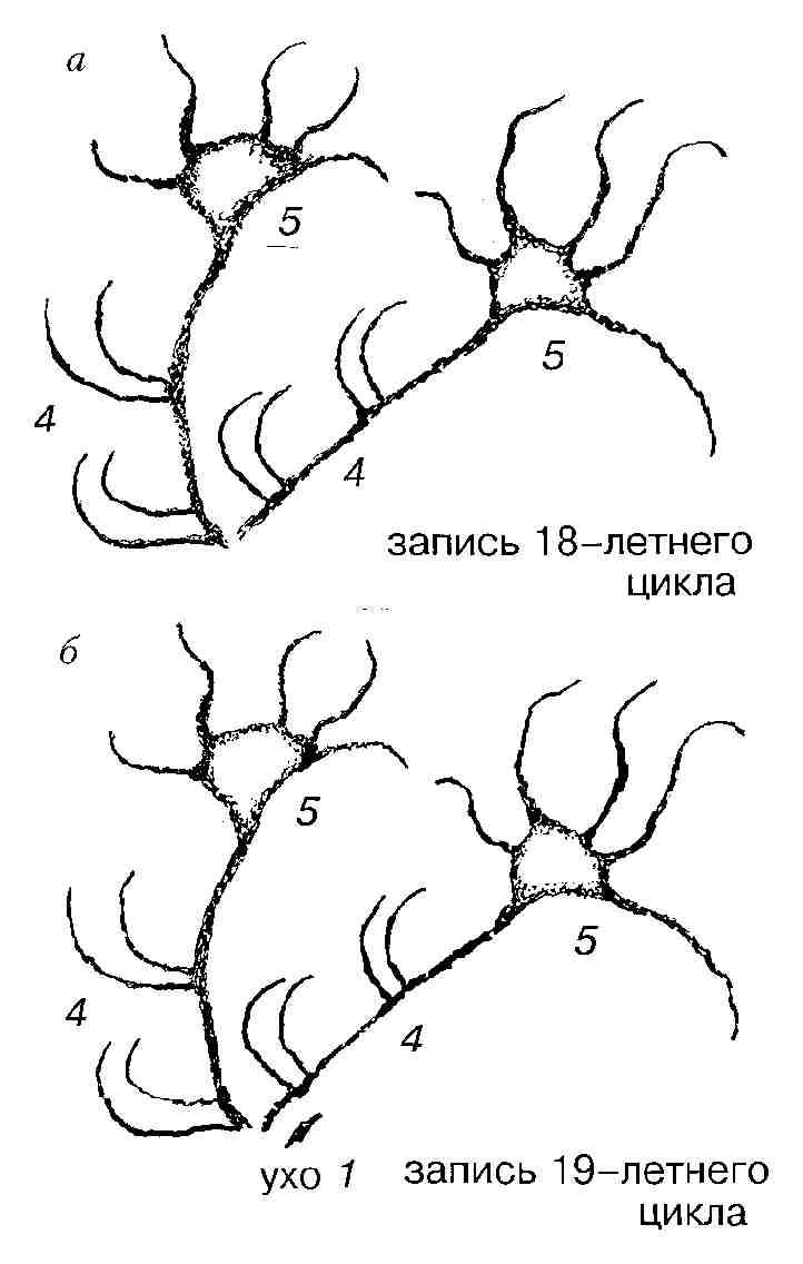 то отыщем недостающий в структурах рогов оленя Ляско символ еще одного года, чтобы можно было составить именно такую последовательность счисления затменных многолетий. Отыскать этот символ не составляет труда, ибо он размещается в непосредственной близости с основаниями обеих ветвей рогов. В качестве такого символа выступало, надо полагать, единственное на рисунке ухо животного (см. рис. 7, б