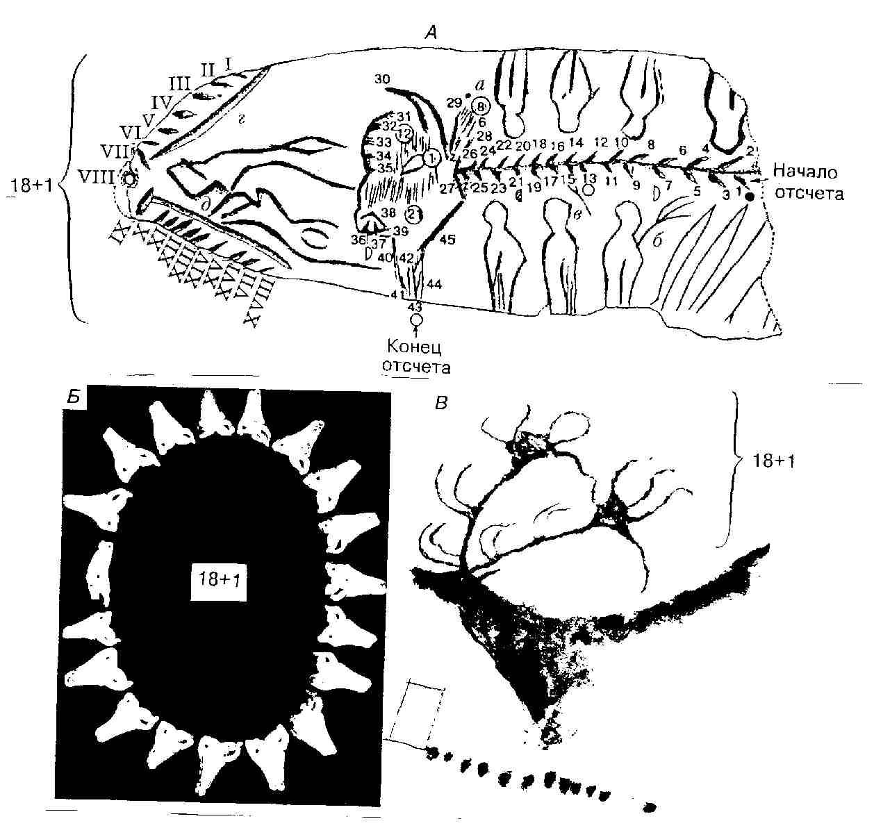 Такие элементы в рогах оленя налицо (см. рис. 7, а) – отростки их, чисто оленьи в нижних отделах стержней (по 4 в каждом), и явно стилизованные, напоминающие пальцы рук или отростки на лопатообразных рогах лося (благородного оленя?) в верхних отделах (по 5 в каждом). Всего отростков 4 + 5 ® 4 + 5 = 18 Астрономическая значимость полученного числа очень высока, ибо если каждый отросток есть символ года, то, в таком случае, оно, это число, знаменует величайший в астрономии и календарях цикл, определяющий периодичность затмений – малый солнечный сарос. То же число, повторенное трижды, определит продолжительность большого солнечного сароса, который позволяет предсказывать повтор случившегося солнечного затмения в конкретном месте наблюдения за фазами Луны и Солнца: 18 лет х 3 = 54 года, с добавлением в конце этого цикла 33(30) суток (они, надо полагать, считывались по календарной записи, размещенной ниже оленя). |
