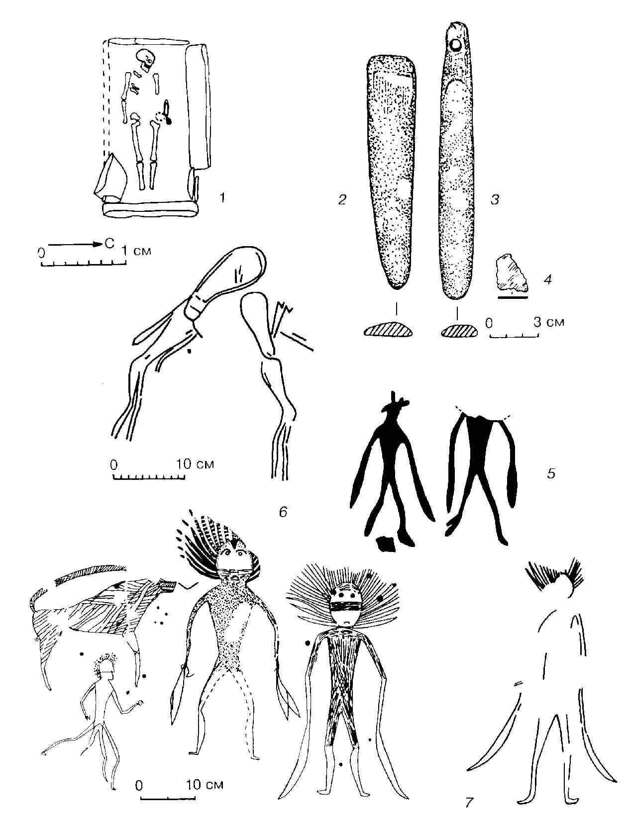 12. Самое любопытное, что композиция из Бешозека близка по содержанию к калбакташской, где хищник также изображен приготовившимся к нападению на группу человеческих фигур. Попытка интерпретации этого небольшого сюжета с привлечением мифологии и данных по этнографии, как полагает автор, была успешной, что собственно подтверждается еще одним синхронным изобразительным “текстом” из Бешозека, мифологическое содержание которого теперь не вызывает сомнения.Помимо небольшой, но великолепной серии рисунков в погребении из Бешозека оказался сопроводительный инвентарь. Он, хотя и малочислен, но имеет важное значение потому, что большая часть захоронений каракольской культуры оказалась безынвентарной. Три предмета, найденные при погребенном в Бешозеке, невыразительны. Их нельзя использовать для хронологических и, тем более, культурных определений ввиду их частой встречаемости в различных и разновременных памятниках Сибири. Также трудно определить назначение этих предметов. Применялись ли они в качестве орудий труда или были культовыми? Тем не менее, рассмотрим их подробнее.