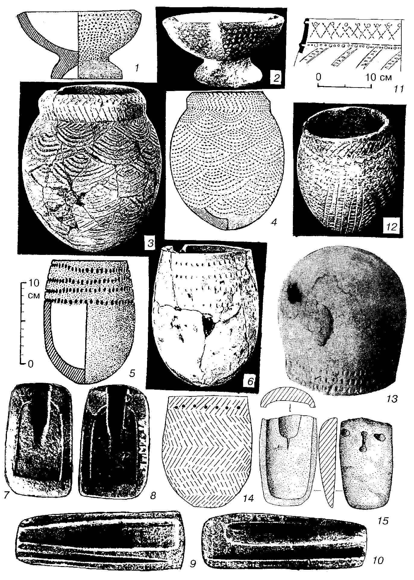 Рис. 1. “Афанасьевские” древности из Синьцзяна и их аналоги.1-10 – из Кээрмуци (Цемурцек) в уезде Алтай (1, 2 – из погребения в большом каменном ящике М24; 3-6 – из оградки М16, но вне погребений; 7-10 – из оградки М17, но вне погребений); 12 – из Сыдуйтуцю (Каньэрцзы) в уезде Цитай; 11, 13 – из Осинкинского могильника в Усть-Пристанском районе Алтайского края; 14, 15 – из кургана у с.Озерное в Онгудайском районе Республики Алтай. 1-6, 11-14 – керамика, 7-10, 15 – камень. Пары 1 и 2, 3 и 4, 5 и 6 изображают одно и то же изделие. Все прорисовки, кроме 11, даны в одном масштабе. Масштаб фонографий разный. 11 – по Н.Л.Членовой, 13 – по Д.Г.Савинову, 14, 15 – по В.Д.Кубареву. Масштабирование выполнено автором. |
