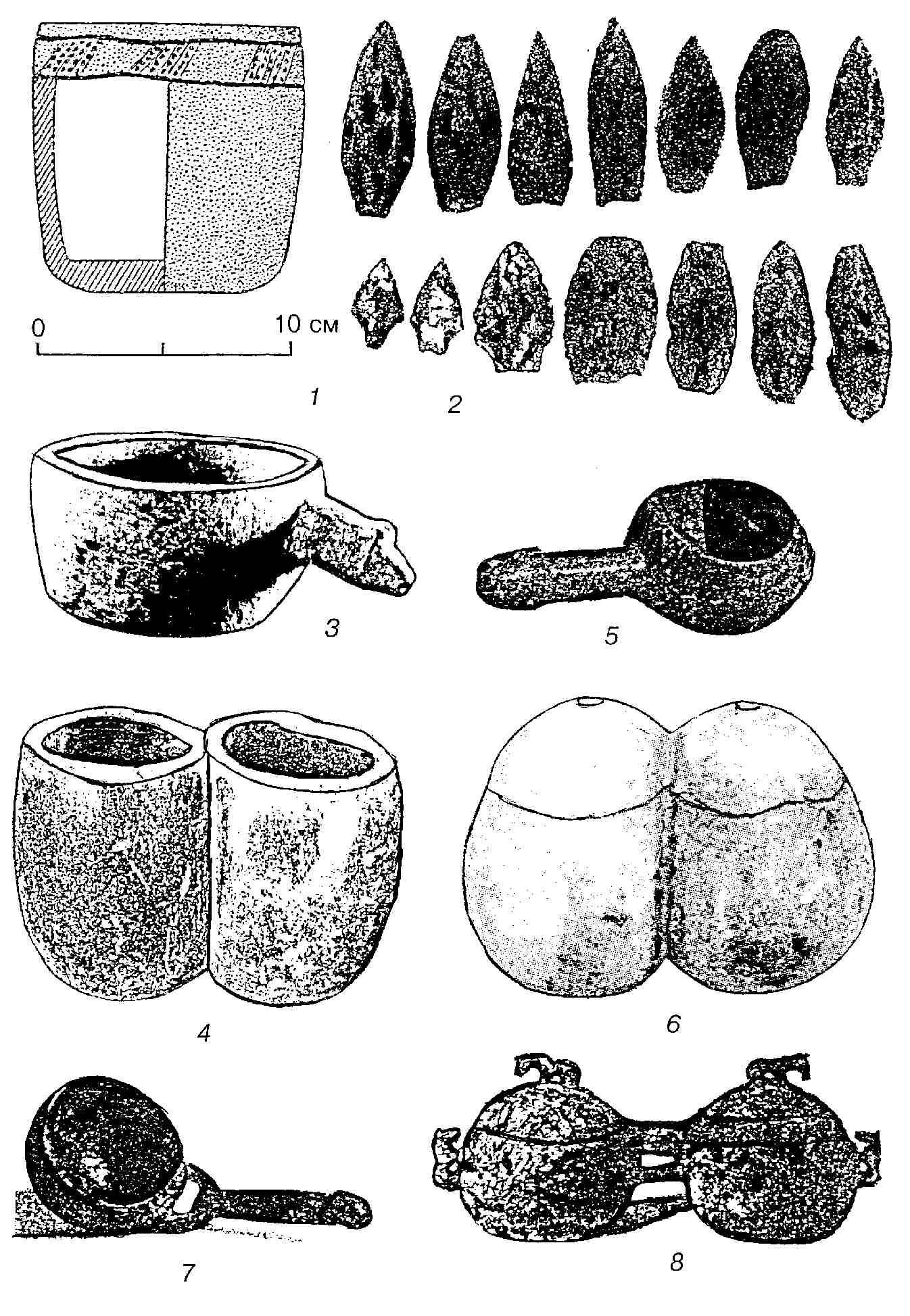 таких ритуальных предметов из обоих районов, как двойные сосуды под выпуклой крышкой, имитирующие женскую грудь (см. рис. 2: 4,6,8) и встречающиеся вместе с ними ковши с прямой фалломорфной ручкой (см. рис. 2: 3,5,7).|