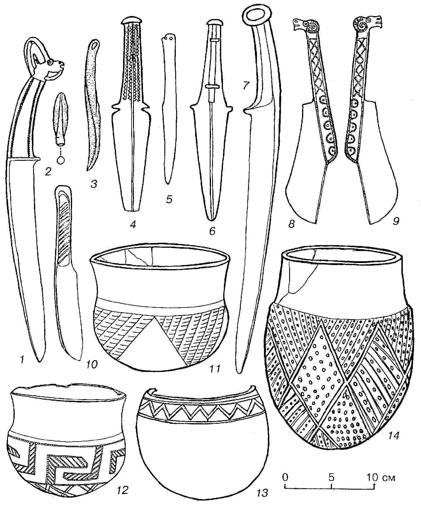 Рис. 3. Изделия “карасукского” облика из Синьцзяна.1-3 – из Хуаюань в уезде Хами (Кумул); 4 – из уезда Цинхэ; 5-6 – из волости Саэрбулакэ (Сарбулак) уезда Хабахэ; 7 – из уезда Токэсунь; 8-10 – из Чабухахэ уезда Синьюань(Гуннайсы, т.е. Конайс); 11 – из Куижэкэбаидэнколасы (Куйжэкбайдэнколас?) уезда Фухай; 12-13 – из деревни Куси (Кусицунь) в волости Авэйтань уезда Алтай; 14 – из Кээрмуци (Цемурцек) уезда Алтай – случайная находка, сделанная не при раскопках; 8, 9 – одно и то же изделие. 1-10 – бронза, 11-14 – керамика. Все, кроме 2, 3 – прорисовки с фотографий. Все прорисовки и масштабирование выполнены автором. |
