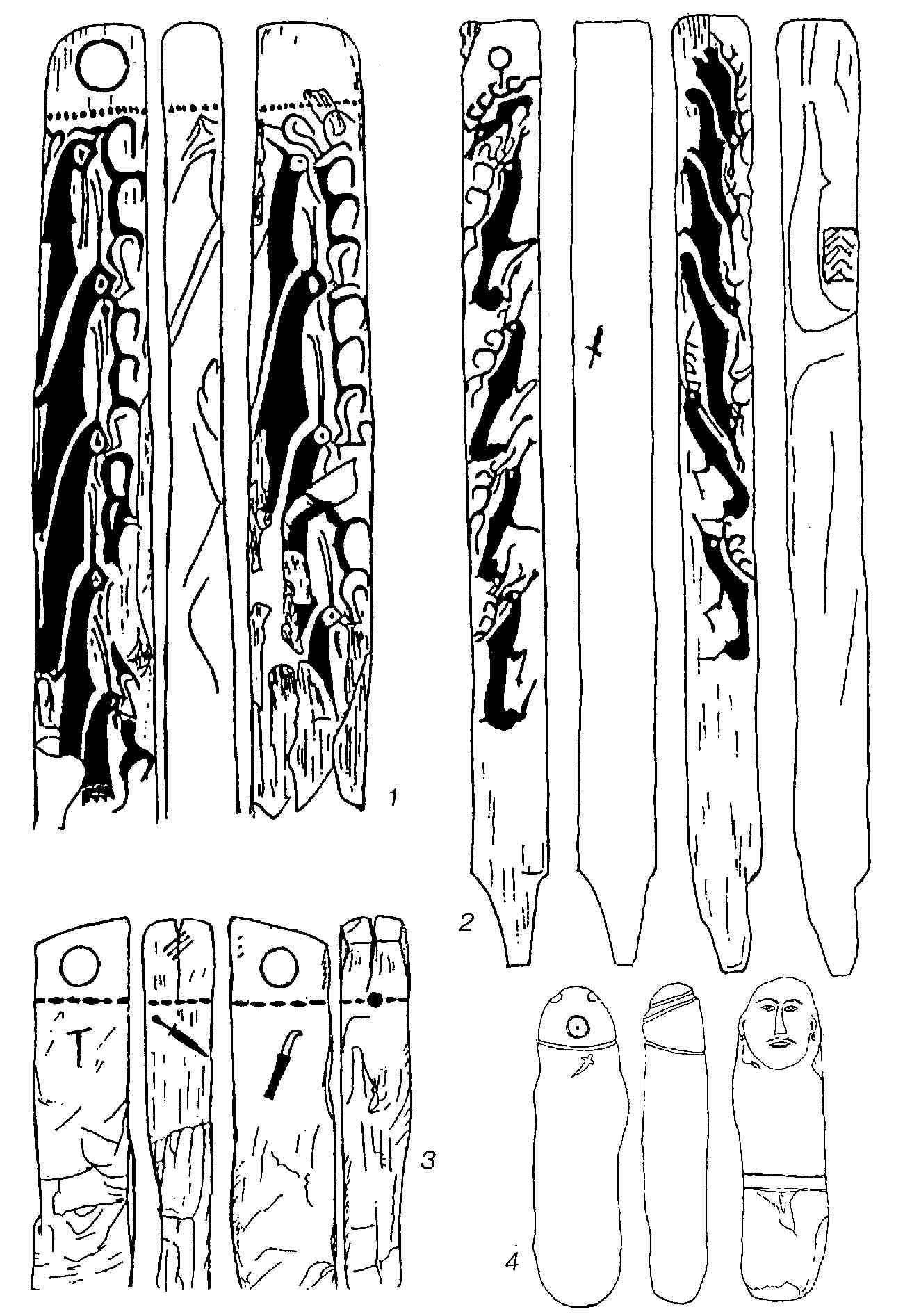 Рис. 4. Оленные камни из Синьцзяна.1 – из Цялагээр (Цяэргээр, т.е. Цялгэр или Цяргэр) в волости Туэрхун (Турхун) уезда Фуюнь (Кектокай); 2 – с могильника Шэбаэркулэ (Шебаркуль) в уезде Цинхэ; 3 – с могильника Тасытэсаи (Тасцай?) в уезде Цинхэ; 4 – из Синьдигоу в уезде Цзимусаэр (Цзимусар). 4 – переоформлен в древнетюркское каменное изваяние. Масштаб разный. |