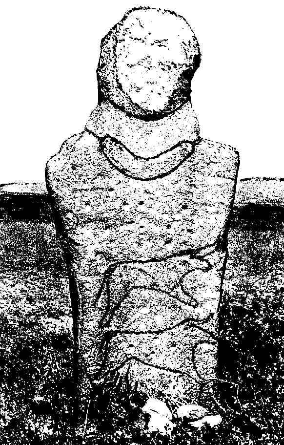 Единственный известный в Синьцзяне оленный камень I типа, с “реалистическими изображениями животных”, происходит из района Акэтубай, что в волости Кээрмуци (Цемурцек) уезда Алтай. По мнению китайских археологов, он переоформлен в древнетюркское каменное изваяние и относится ими к оленным камням саяно-алтайского стиля . Мне кажется, что эта стела вообще причислена к оленным камням ошибочно. Она представляет собой вертикально стоящую плоскую подпрямоугольную каменную плиту, на широкой грани которой одно под другим нанесены несколько крупных изображений быков с направленными вперед изогнутыми рогами. Фигуры быков перекрыты разбросанными там и сям углублениями-ямками, а верх плиты оформлен в виде человеческой головы с четко обозначенным лицом и висящей ниже него на шее пекторалью (рис. 5). Очевидно, что данная стела была создана в эпоху бронзы и переиспользована позже, возможно, не только в древнетюркское, но и в скифское время. Территориально и композиционно ближайшим ее аналогом является плита из пос.Озерного в Горном Алтае [Молодин В.И., Погожева А.П., 1990]. Правда, стилистически изображения животных на двух памятниках несколько различаются. Что касается углублений-ямок, то они представляют собой микроформы карстового рельефа, известные среди специалистов как лунковые карры. Видимо, аналогично по происхождению и большинство углублений на так называемых “чашечных камнях” [Кубарев В.Д., 1986], поскольку микрокарры, как желобковые, в виде мелких и узких, в 2–3 см, параллельных желобков, так и лунковые, в виде сферических углублений диаметром до 6 см и глубиной 1–2 см, особенно характерны для долины р. Чуи в Горном Алтае [Гвоздецкий Н.А., 1972, с. 159–160]. |