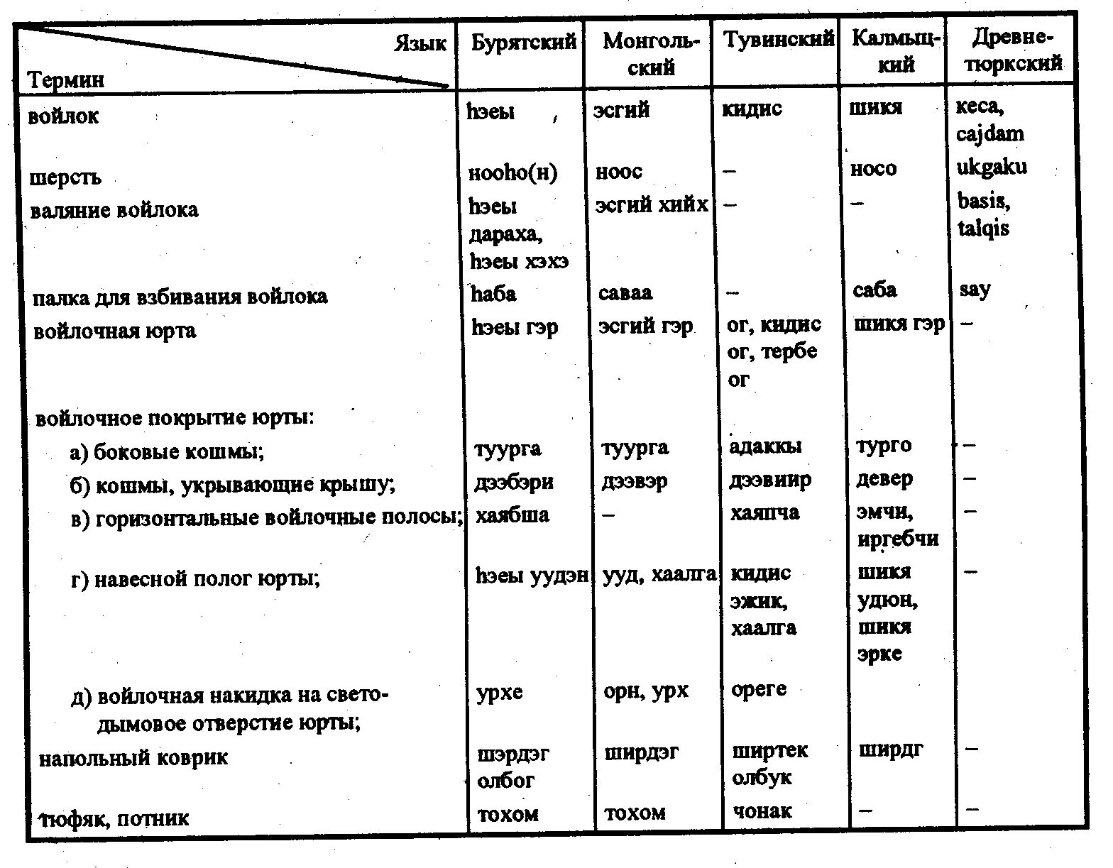21.Данные из языков монгольских народов, а также тувинцев и древнетюркского языка указывают на существование в прошлом (предположительно в XIII–XV веках) тесных этнических контактов между предками бурят, монголов, калмыков и тувинцев (cм. табл.), что возможно объясняется их вхождением в тот период в единое экономическое, культурное пространство, созданное государством Хамаг Монгол (чингизидов).