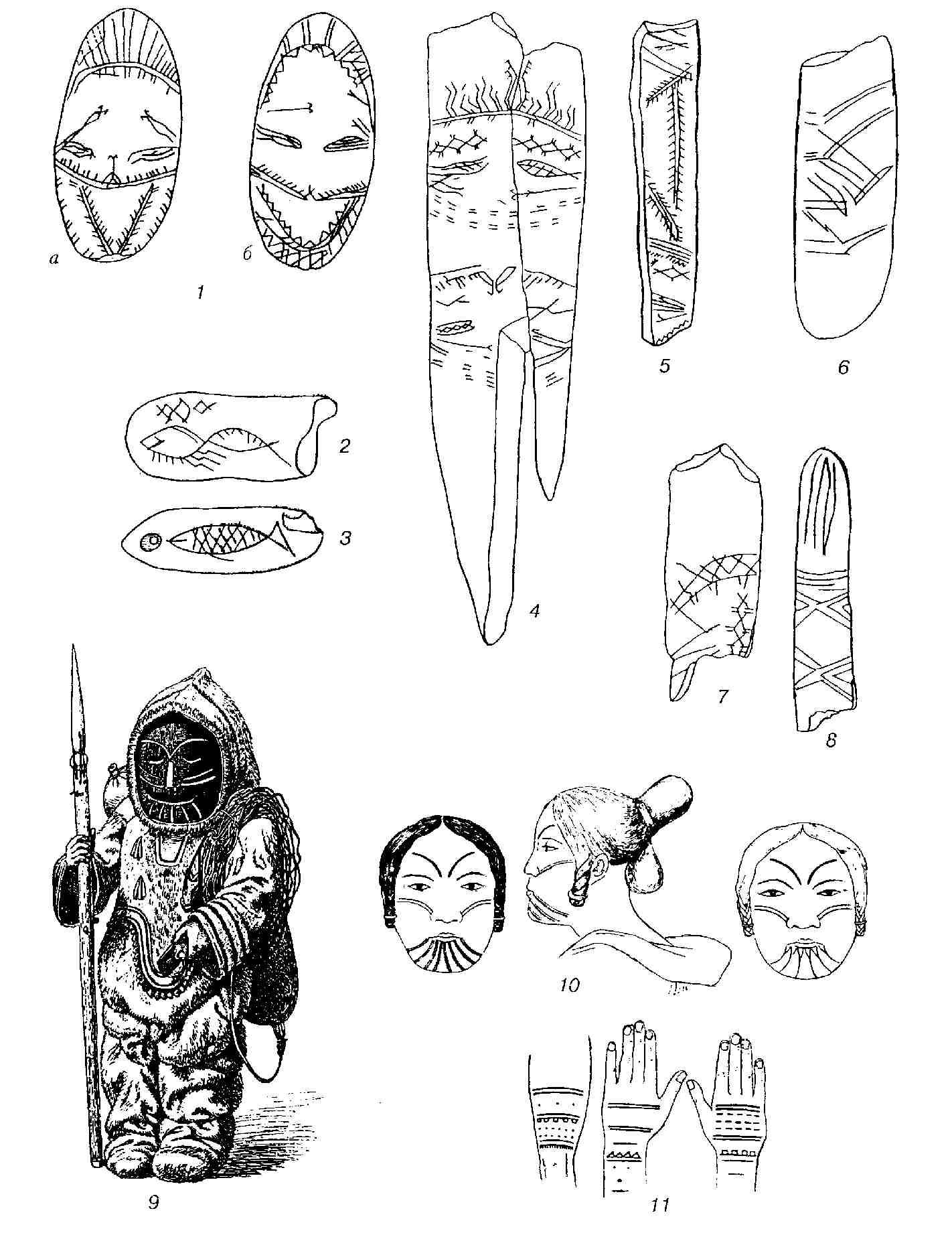 – гравировальные гальки с Ангары; 9 – эскимосская маска, 10-11 – татуировка.