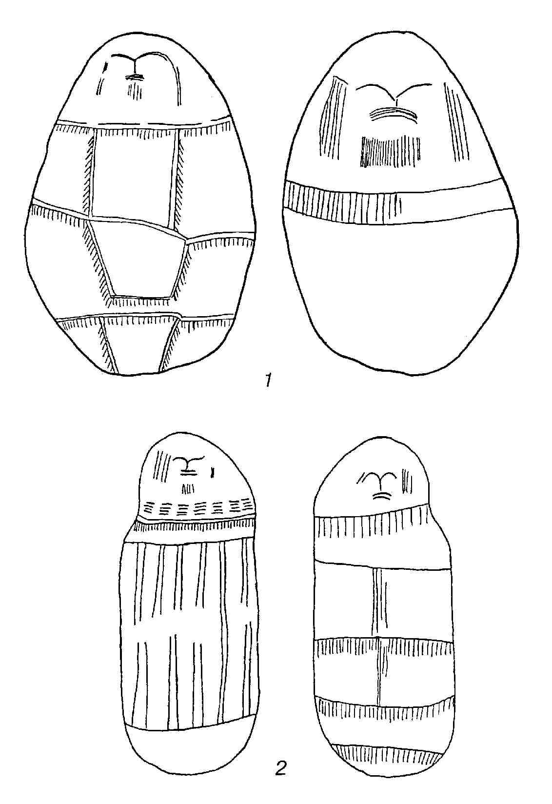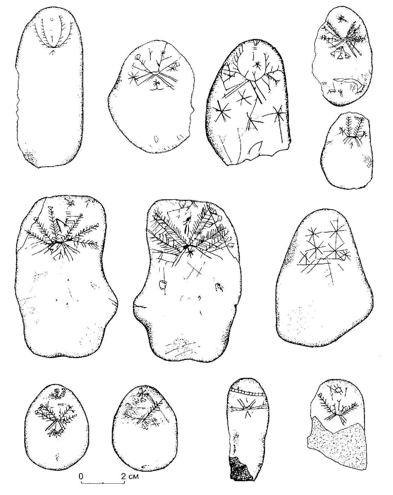 Гравировальные гальки с поселения Торгажак.Своеобразный орнамент в виде парных пунктирных линий, точечный или треугольно-зубчатый узор наносились на кисти рук и предплечья (см. рис. 1,