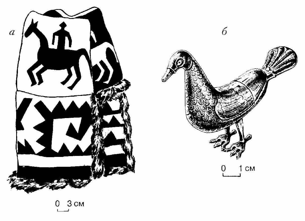 Рис.1. а - “богатырский” шлем из сукна синего и зеленого цвета, нач. XX в., с.Хулимсунт; б - серебряная фигурка гуся, кон. XIX в., с. Турват-пауль. |