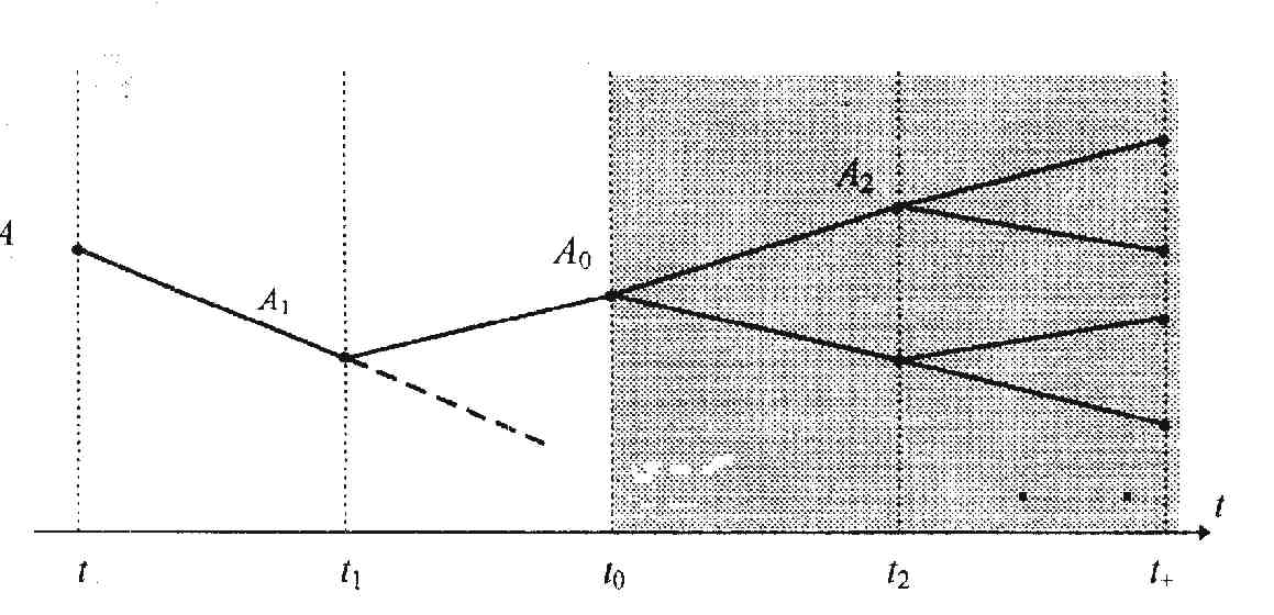 t0, что, скажем, в момент t2 мы находимся в точке A2 "дерева" действий. В общем случае к точке A2 ведет из A0 лишь одна траектория. В силу произвольности момента t2 оказывается, что мы всегда действуем лишь единственно возможным образом. В этом и заключается сущность концепции теологического детерминизма.Для упрощения последующих рисунков будем проецировать точки, изображающие действия, на временную ось, так что схема рис.1 примет вид, показанный на рис.2.
